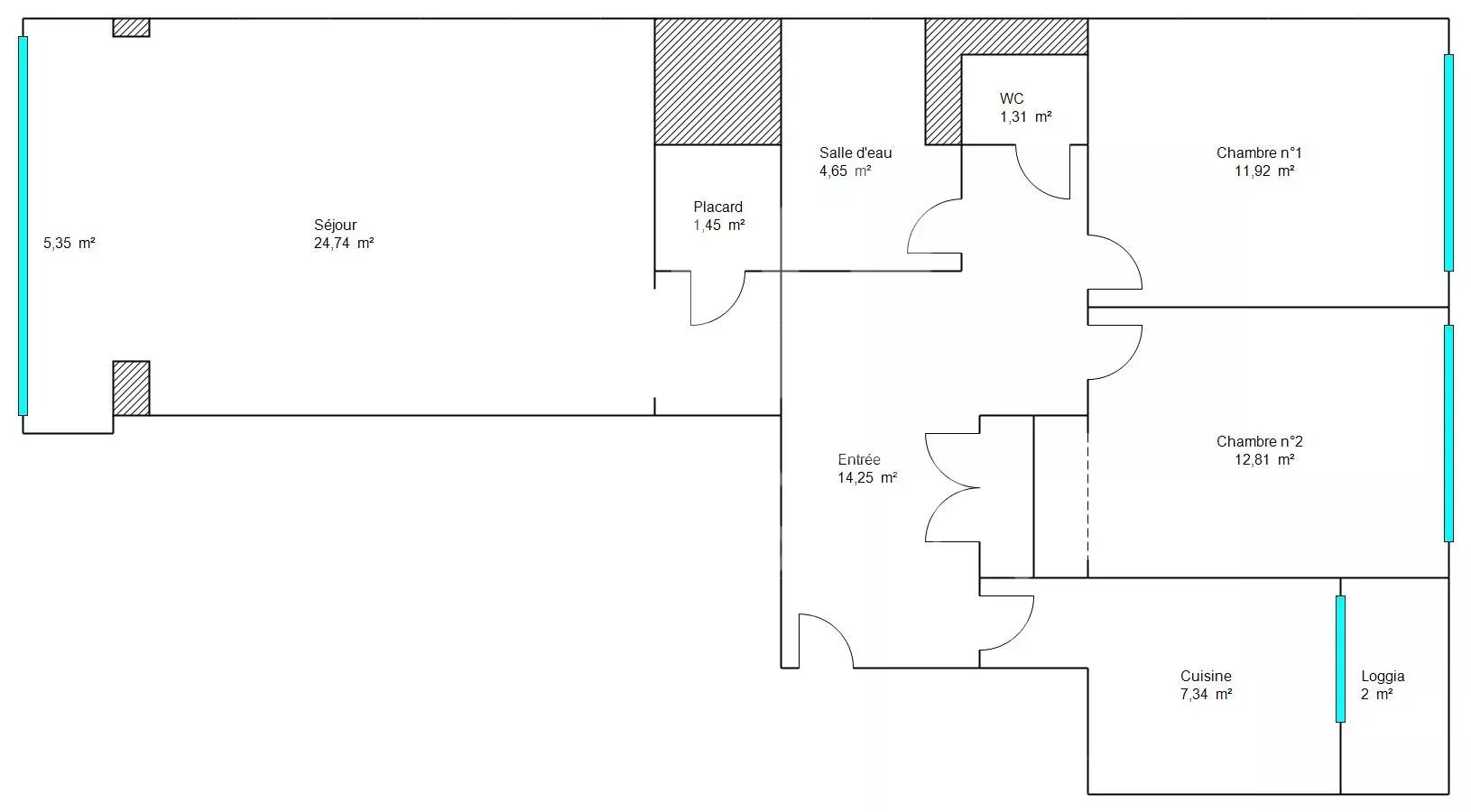 La loggia et le dressing nous permettent ainsi d'augmenter les espaces de rangements de cet appartement.
