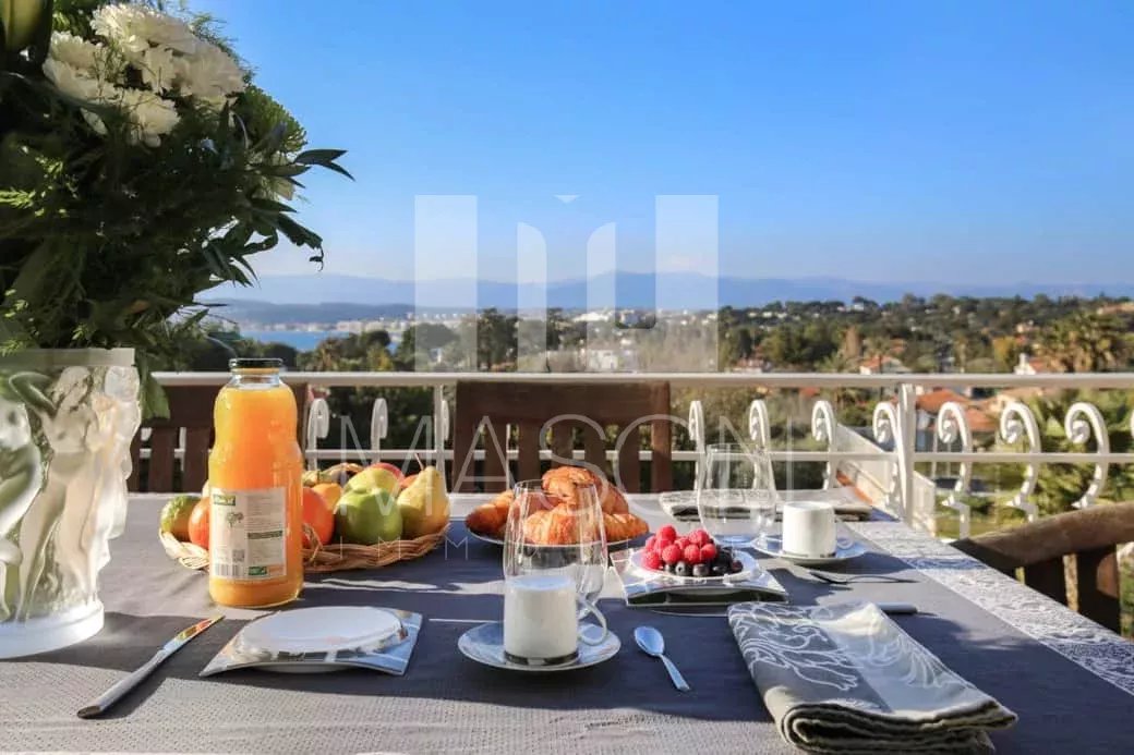 La terrasse au rez-de-chaussée (avec table à manger pour 8 personnes) et le balcon au premier étage offrant une vue imprenable sur la baie de Juan les Pins et l'île Sainte-Marguerite.