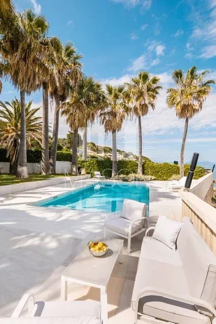 Villa avec vue panoramique sur baie de Cannes , sur 2 niveaux composèe au rdc d'une hall d'entrée avec placards et toilette invité, grand salon très confortable avec cheminée et salle à manger donnant sur balcons et loggia, cuisine équipée de tout,1...