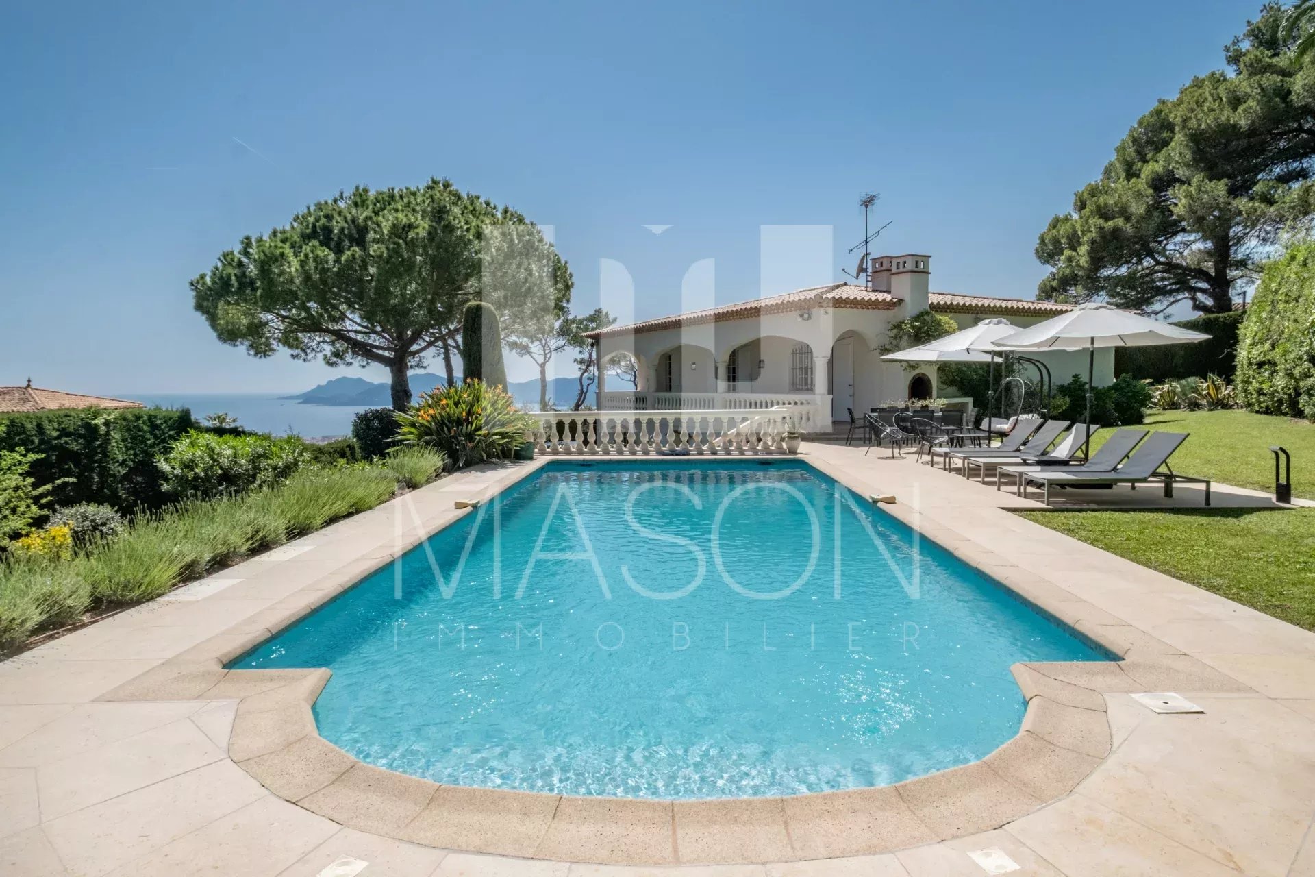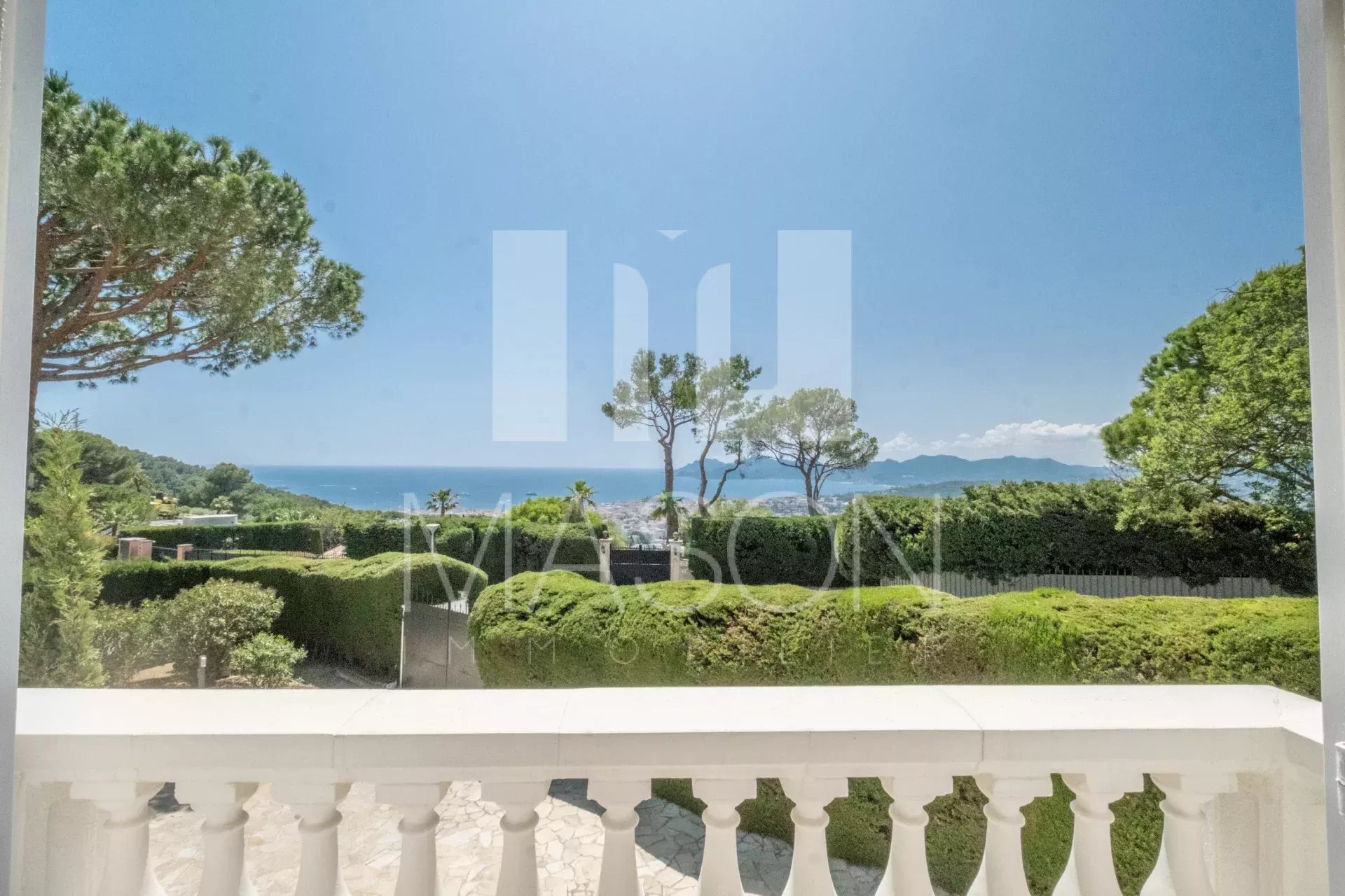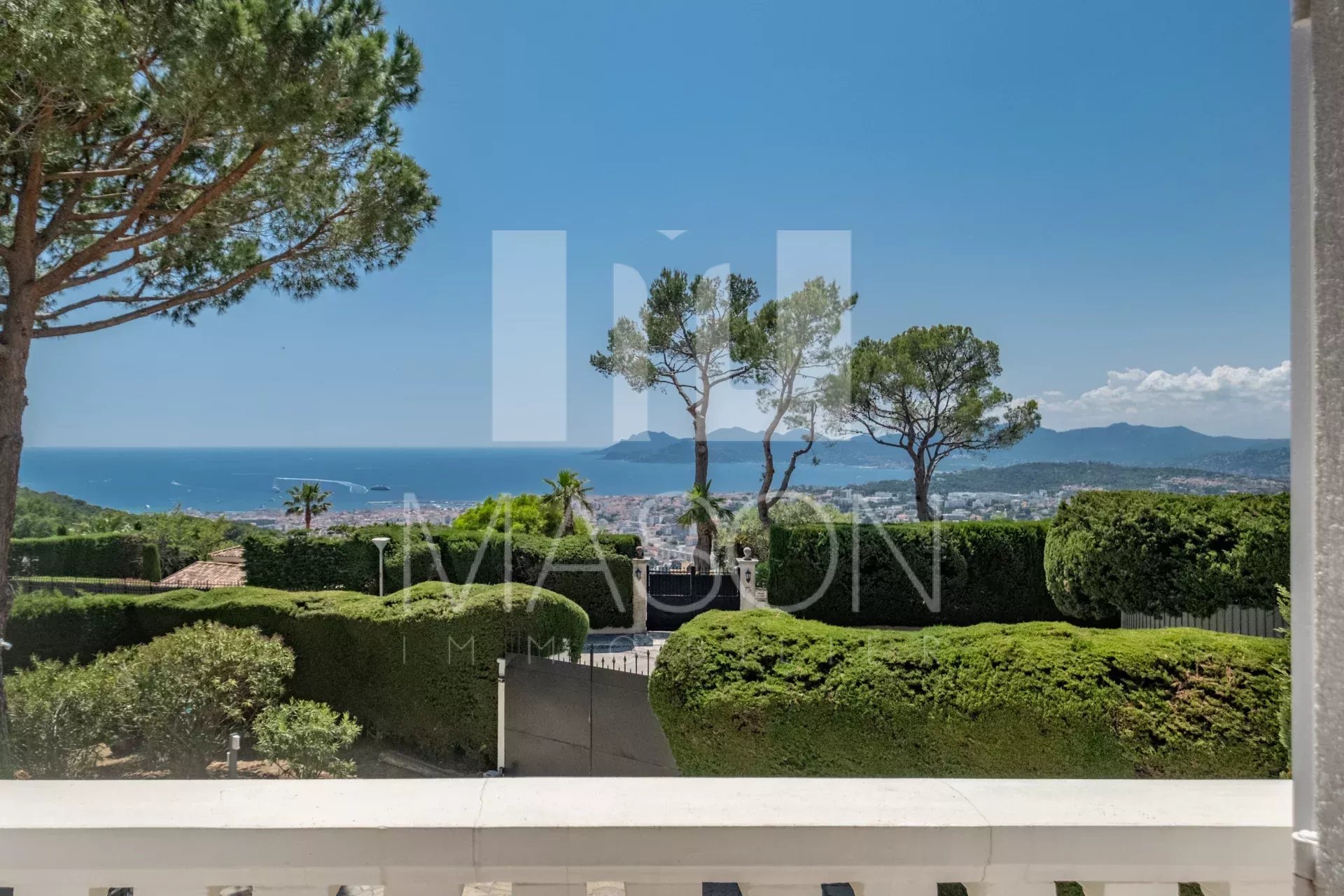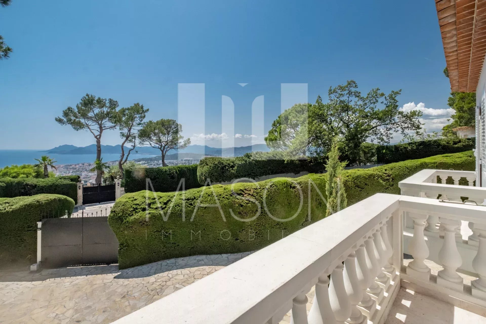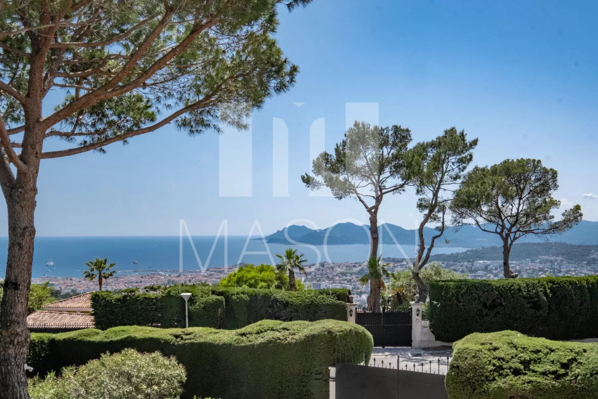Villa avec vue panoramique sur baie de Cannes , sur 2 niveaux composèe au rdc d'une hall d'entrée avec placards et toilette invité, grand salon très confortable avec cheminée et salle à manger donnant sur balcons et loggia, cuisine équipée de tout,1 chambre avec sa salle de bains, en rez de jardin 3 grandes chambres avec placards et toutes donnant sur jardin, 3 salles de bain plus une pièce aveugle pouvant servir de 5ème chambre avec un lit de 140 , Coffre fort. Entierement climatisée. Terrasse equipée pour vos repas en pleine air,salon d'été,BBQ et plancha. Piscine chauffée 11X5m. 2000m2 de Jardin clôturé et arboré, portail automatisé, alarme reliée à société de surveillance 6 caméras vidéo avec écran LCD barrières de sécurité infra rouge, garage fermé parking 6 voitures internet WIFI TV HIFI, éclairage jardin, table de tennis.
