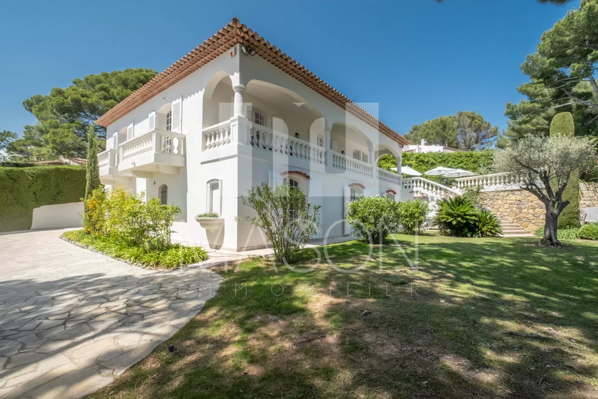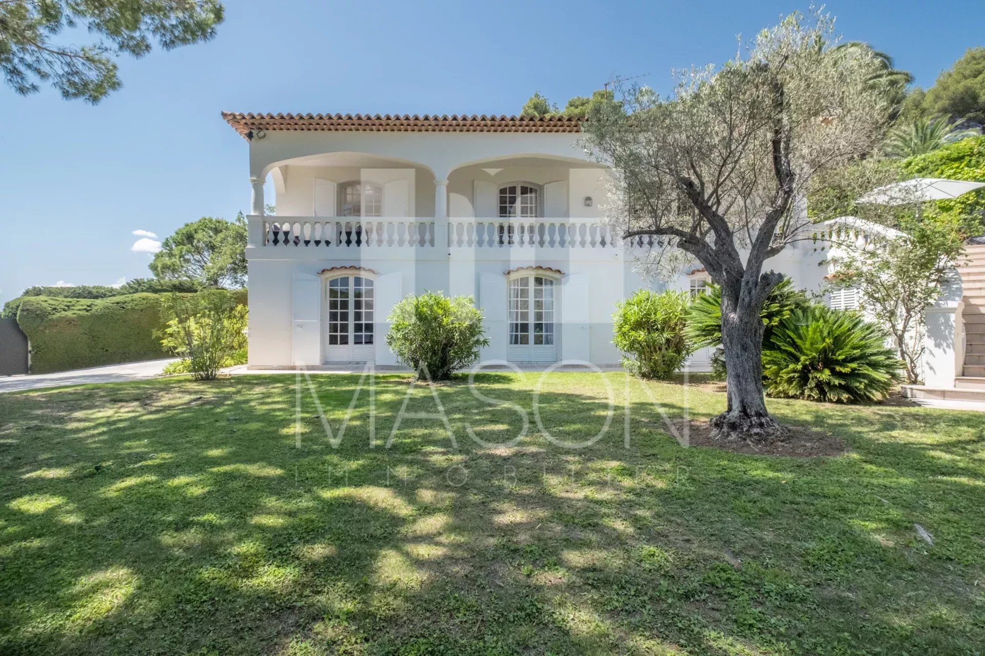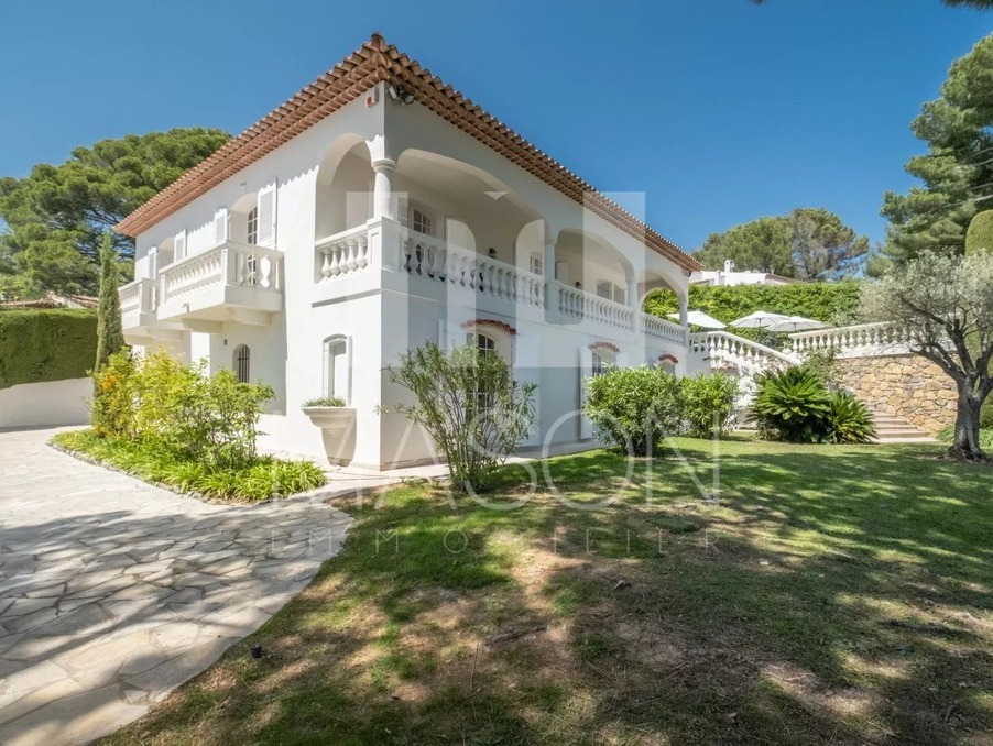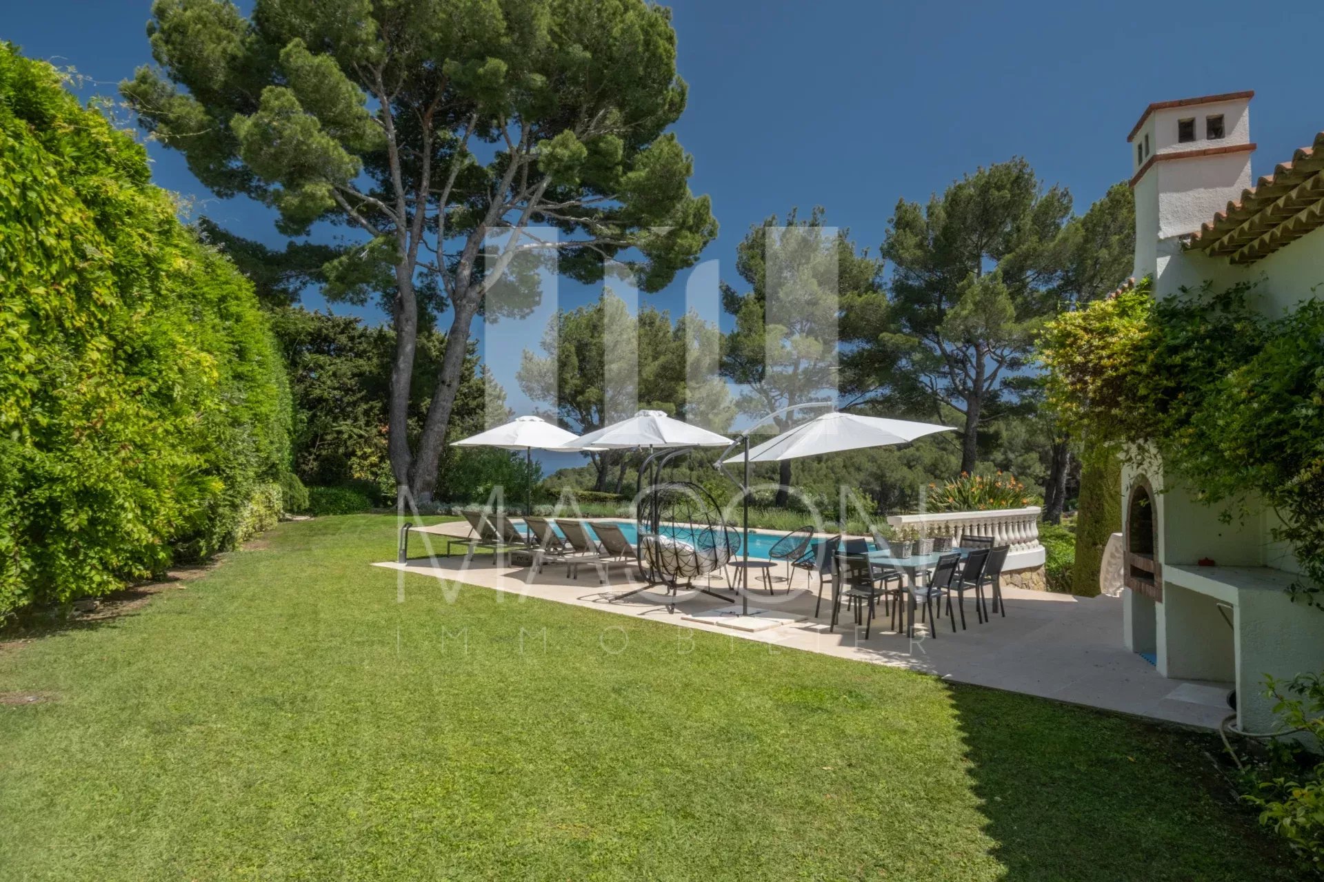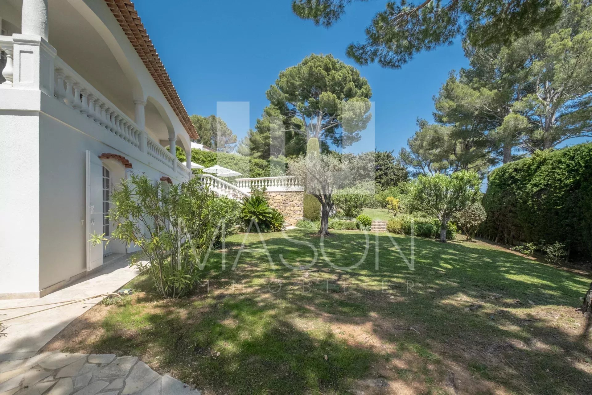 Villa avec vue panoramique sur baie de Cannes , sur 2 niveaux composèe au rdc d'une hall d'entrée avec placards et toilette invité, grand salon très confortable avec cheminée et salle à manger donnant sur balcons et loggia, cuisine équipée de tout,1 chambre avec sa salle de bains, en rez de jardin 3 grandes chambres avec placards et toutes donnant sur jardin, 3 salles de bain plus une pièce aveugle pouvant servir de 5ème chambre avec un lit de 140 , Coffre fort. Entierement climatisée. Terrasse equipée pour vos repas en pleine air,salon d'été,BBQ et plancha. Piscine chauffée 11X5m. 2000m2 de Jardin clôturé et arboré, portail automatisé, alarme reliée à société de surveillance 6 caméras vidéo avec écran LCD barrières de sécurité infra rouge, garage fermé parking 6 voitures internet WIFI TV HIFI, éclairage jardin, table de tennis.