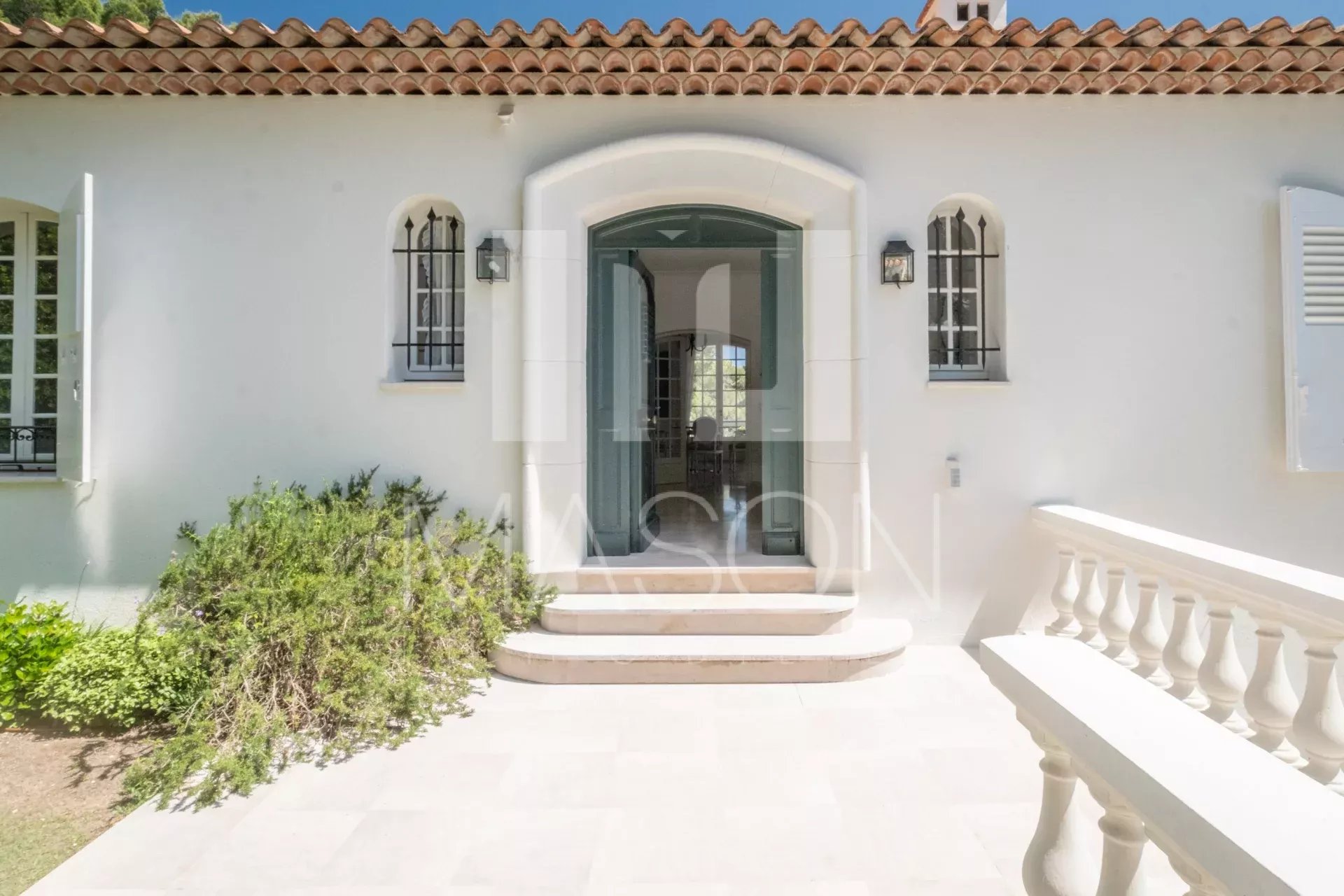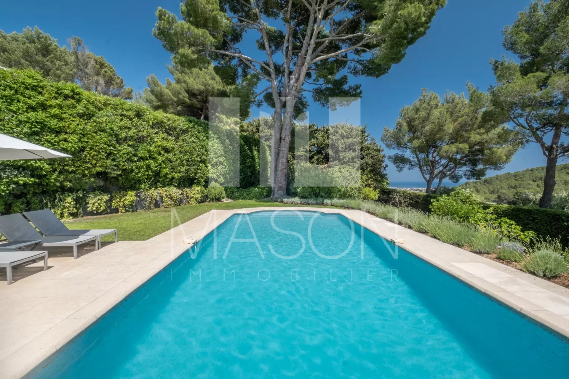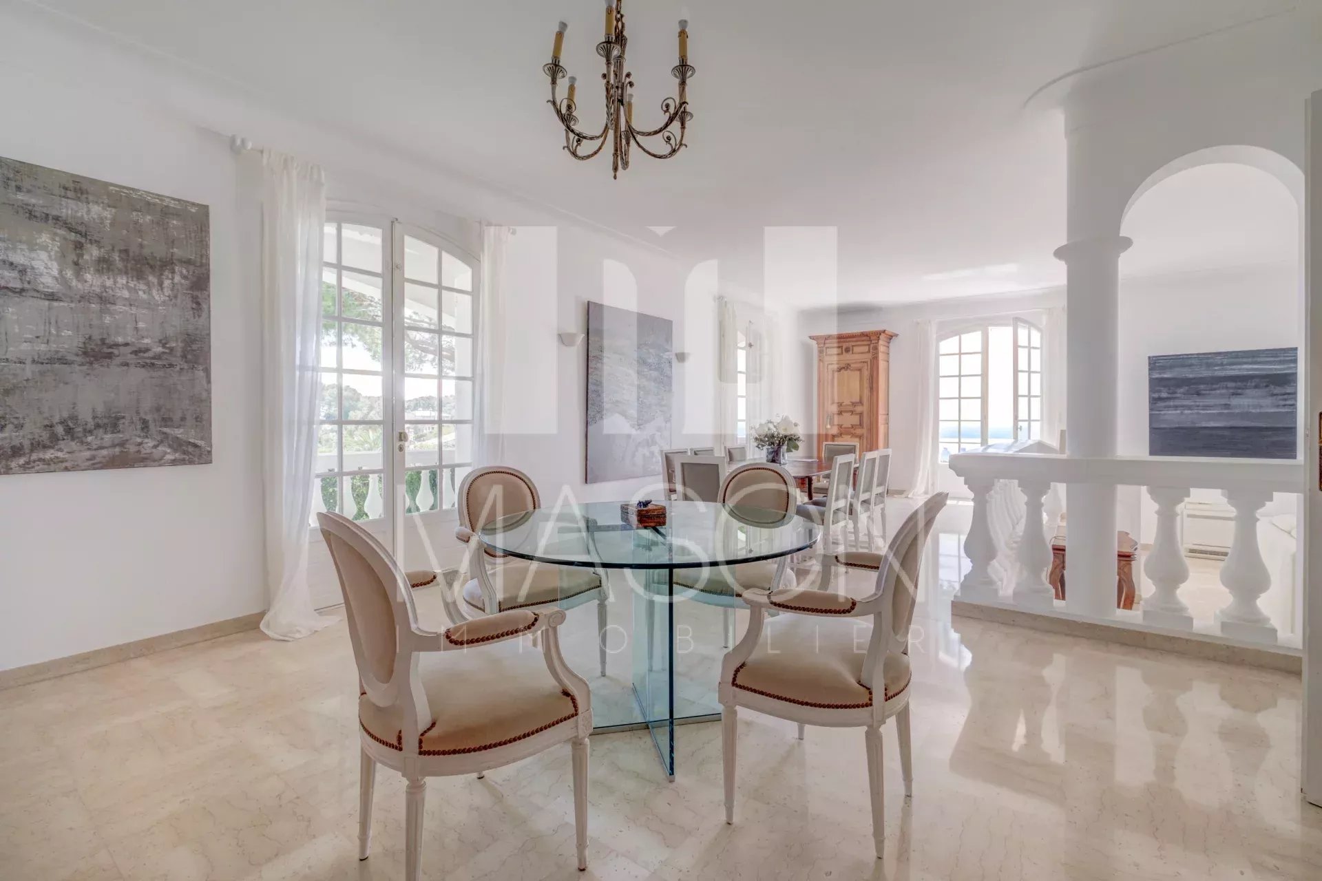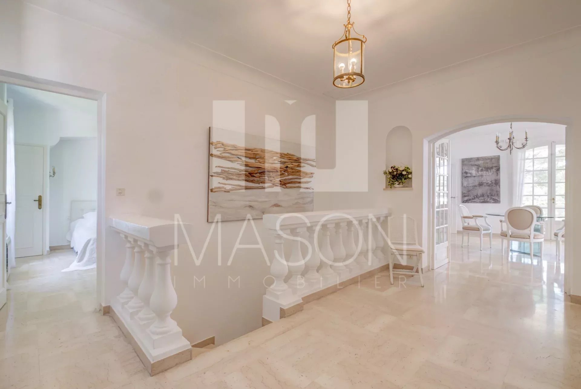 Villa avec vue panoramique sur baie de Cannes , sur 2 niveaux composèe au rdc d'une hall d'entrée avec placards et toilette invité, grand salon très confortable avec cheminée et salle à manger donnant sur balcons et loggia, cuisine équipée de tout,1 chambre avec sa salle de bains, en rez de jardin 3 grandes chambres avec placards et toutes donnant sur jardin, 3 salles de bain plus une pièce aveugle pouvant servir de 5ème chambre avec un lit de 140 , Coffre fort. Entierement climatisée. Terrasse equipée pour vos repas en pleine air,salon d'été,BBQ et plancha. Piscine chauffée 11X5m. 2000m2 de Jardin clôturé et arboré, portail automatisé, alarme reliée à société de surveillance 6 caméras vidéo avec écran LCD barrières de sécurité infra rouge, garage fermé parking 6 voitures internet WIFI TV HIFI, éclairage jardin, table de tennis.