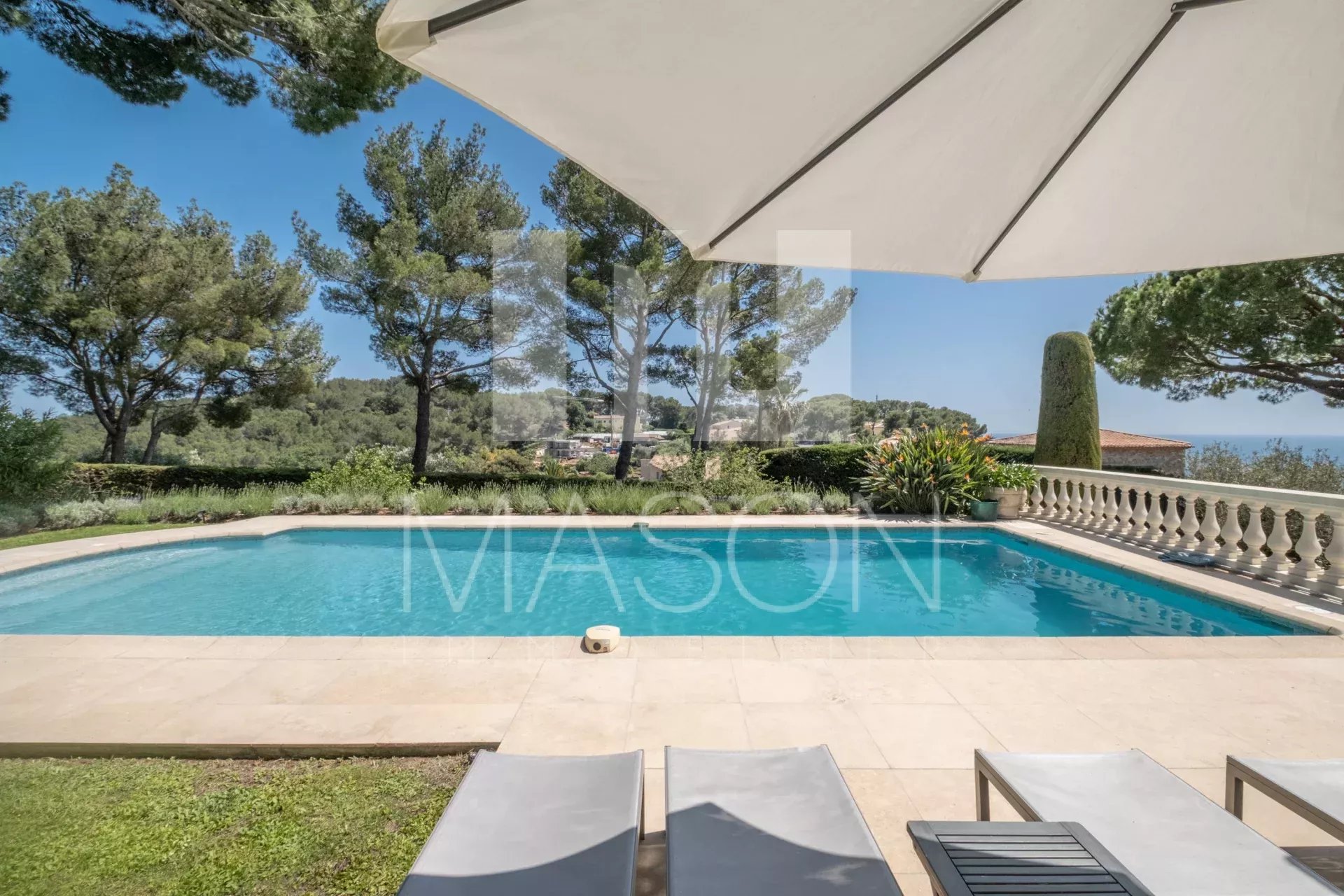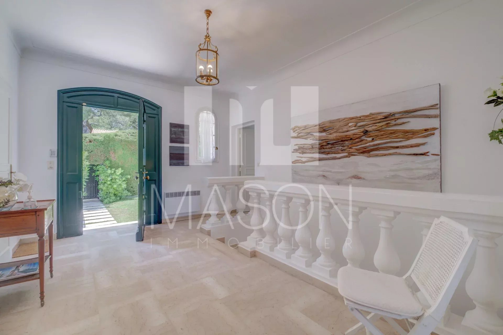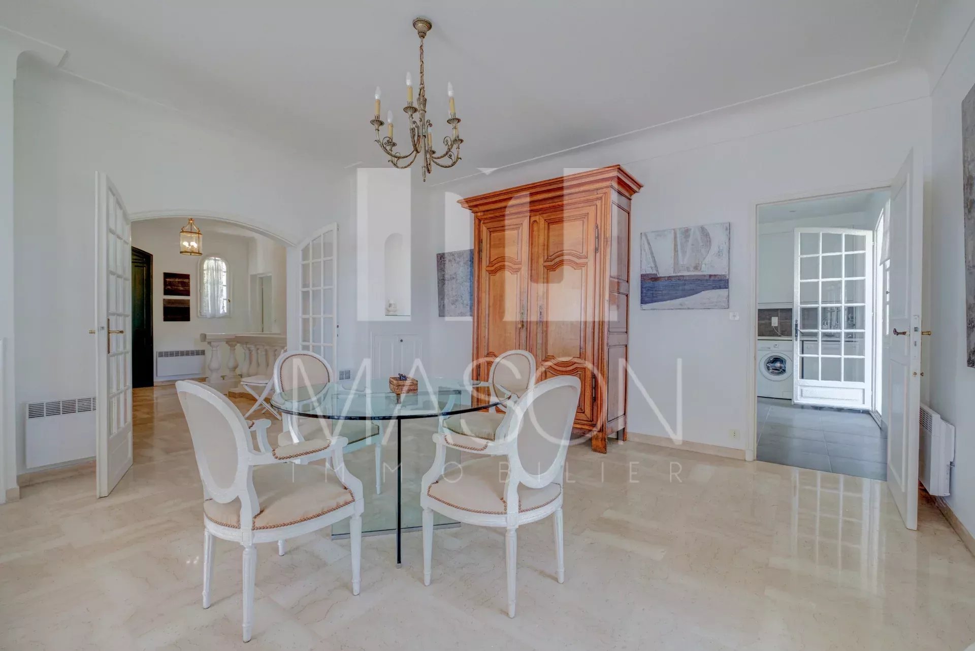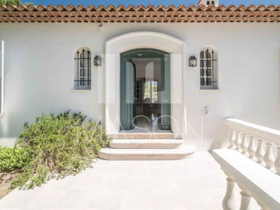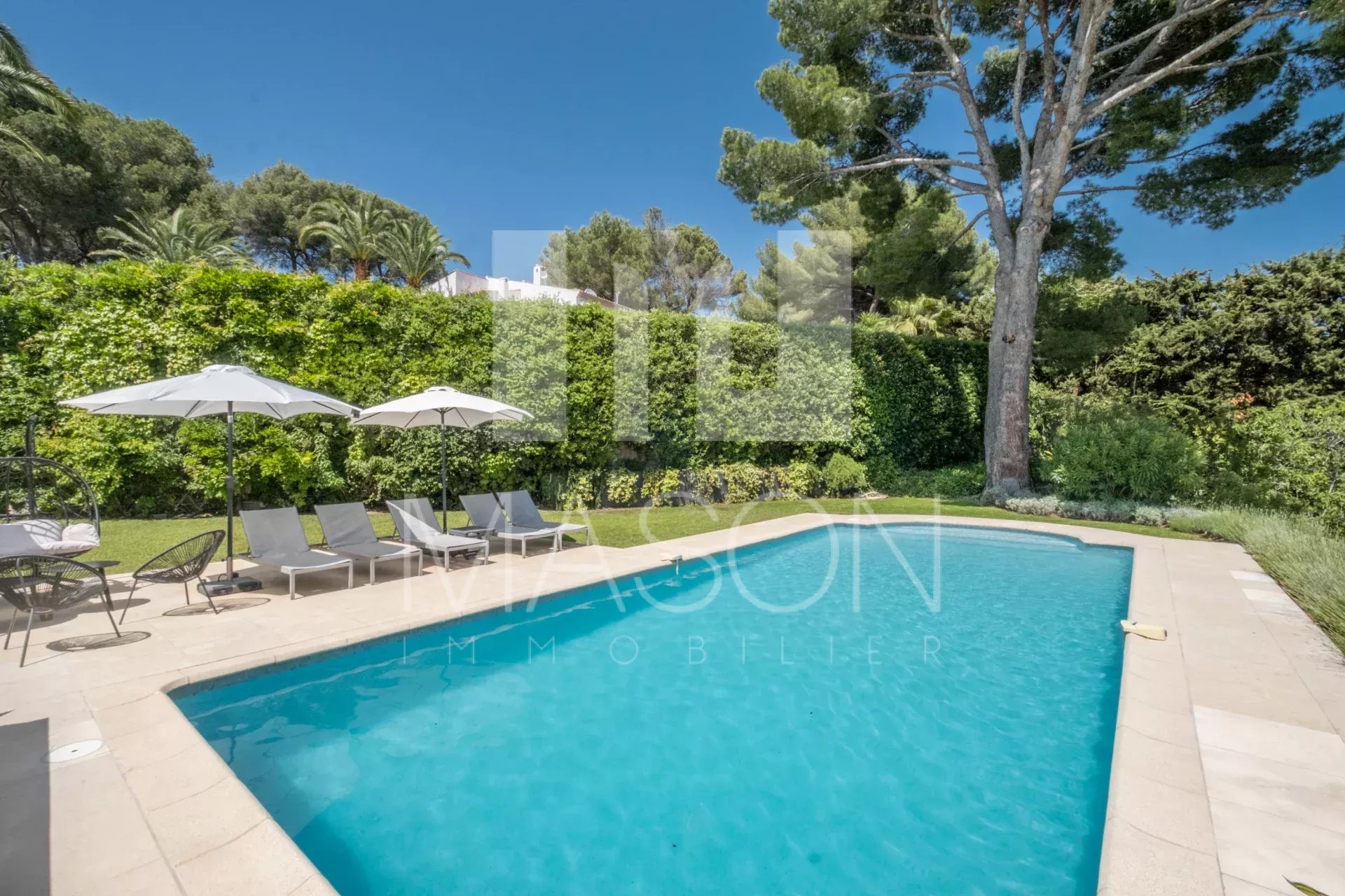 Villa avec vue panoramique sur baie de Cannes , sur 2 niveaux composèe au rdc d'une hall d'entrée avec placards et toilette invité, grand salon très confortable avec cheminée et salle à manger donnant sur balcons et loggia, cuisine équipée de tout,1 chambre avec sa salle de bains, en rez de jardin 3 grandes chambres avec placards et toutes donnant sur jardin, 3 salles de bain plus une pièce aveugle pouvant servir de 5ème chambre avec un lit de 140 , Coffre fort. Entierement climatisée. Terrasse equipée pour vos repas en pleine air,salon d'été,BBQ et plancha. Piscine chauffée 11X5m. 2000m2 de Jardin clôturé et arboré, portail automatisé, alarme reliée à société de surveillance 6 caméras vidéo avec écran LCD barrières de sécurité infra rouge, garage fermé parking 6 voitures internet WIFI TV HIFI, éclairage jardin, table de tennis.