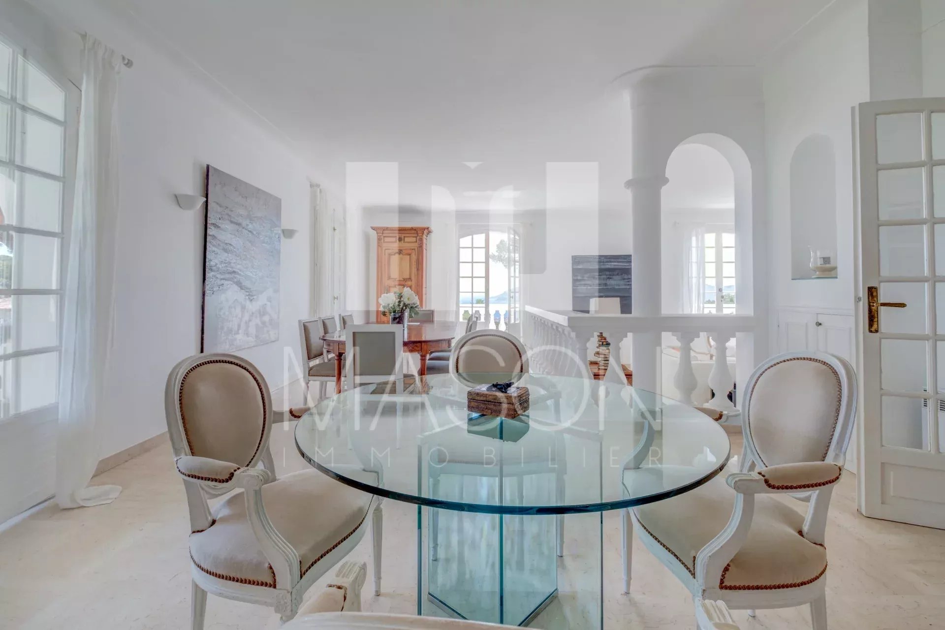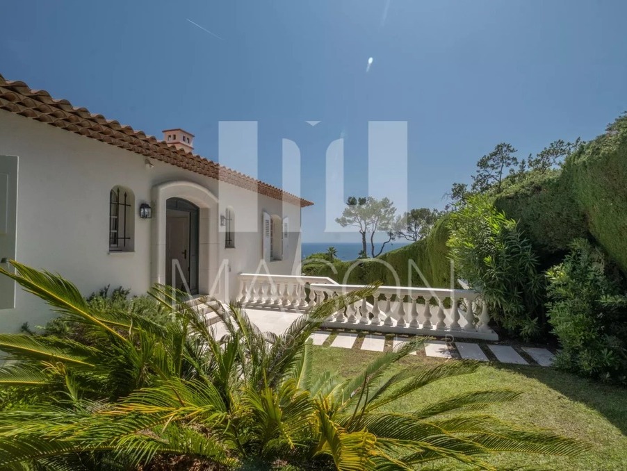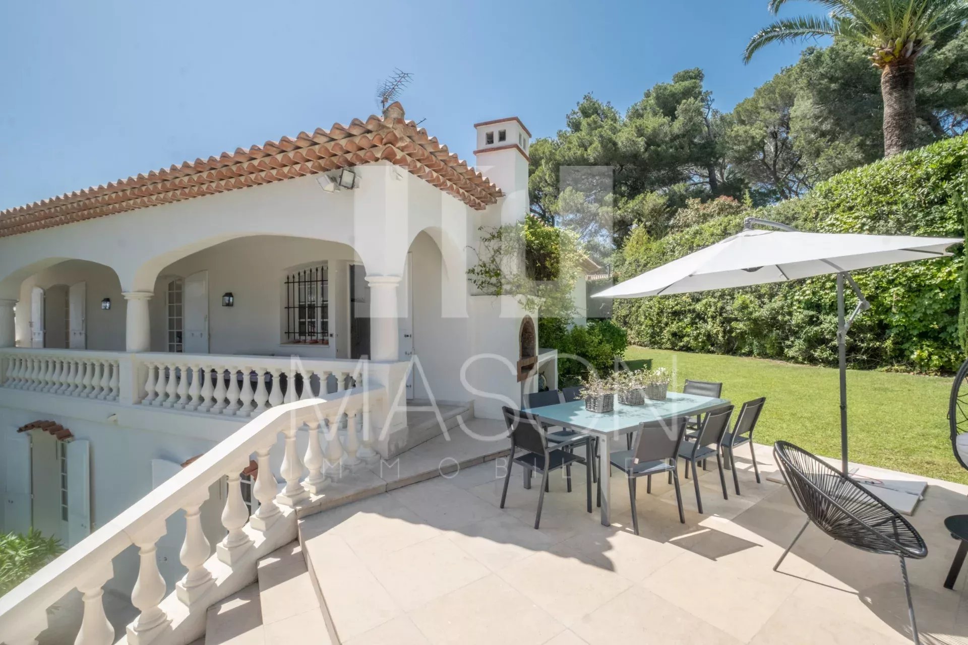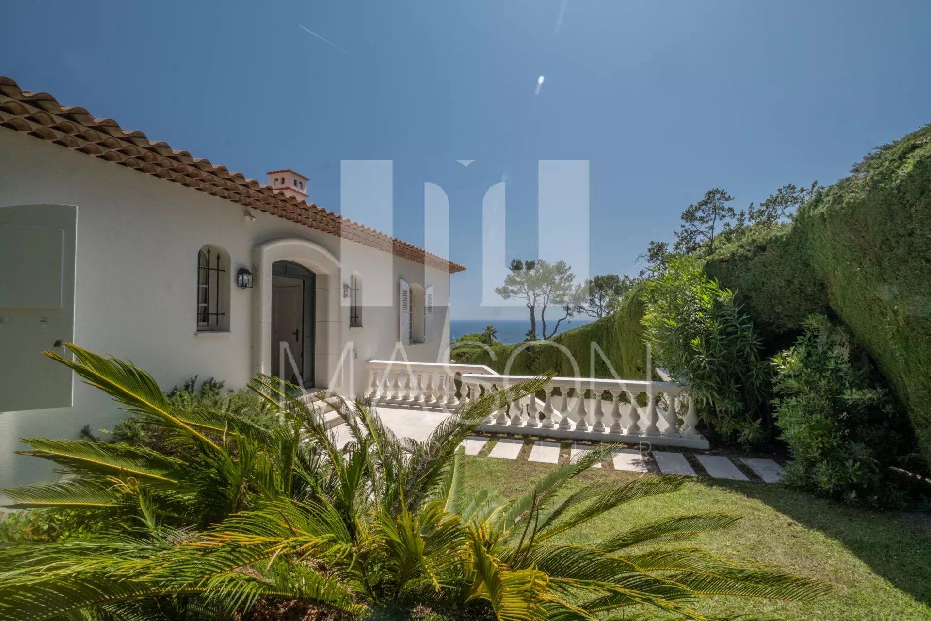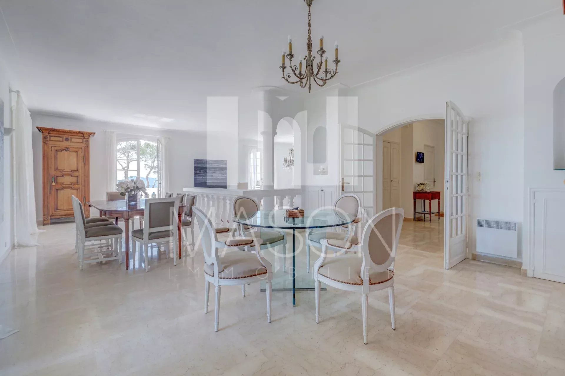 Villa avec vue panoramique sur baie de Cannes , sur 2 niveaux composèe au rdc d'une hall d'entrée avec placards et toilette invité, grand salon très confortable avec cheminée et salle à manger donnant sur balcons et loggia, cuisine équipée de tout,1 chambre avec sa salle de bains, en rez de jardin 3 grandes chambres avec placards et toutes donnant sur jardin, 3 salles de bain plus une pièce aveugle pouvant servir de 5ème chambre avec un lit de 140 , Coffre fort. Entierement climatisée. Terrasse equipée pour vos repas en pleine air,salon d'été,BBQ et plancha. Piscine chauffée 11X5m. 2000m2 de Jardin clôturé et arboré, portail automatisé, alarme reliée à société de surveillance 6 caméras vidéo avec écran LCD barrières de sécurité infra rouge, garage fermé parking 6 voitures internet WIFI TV HIFI, éclairage jardin, table de tennis.