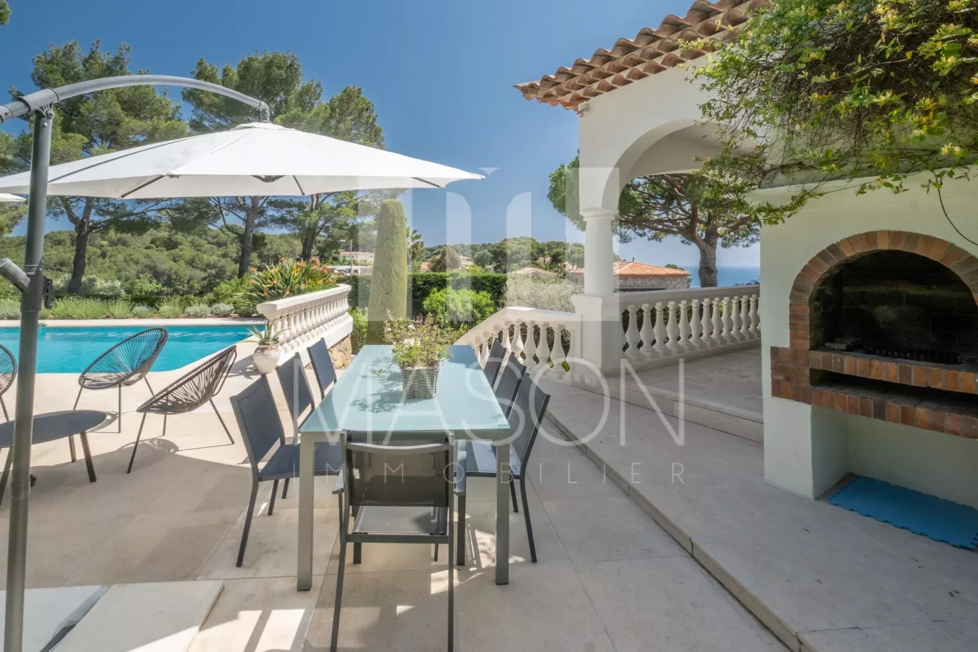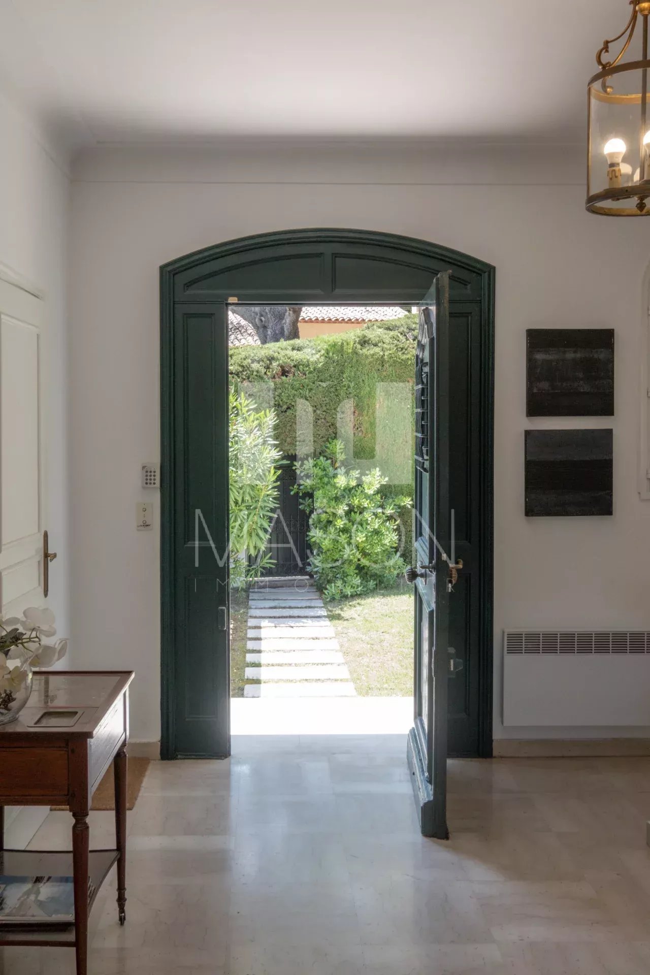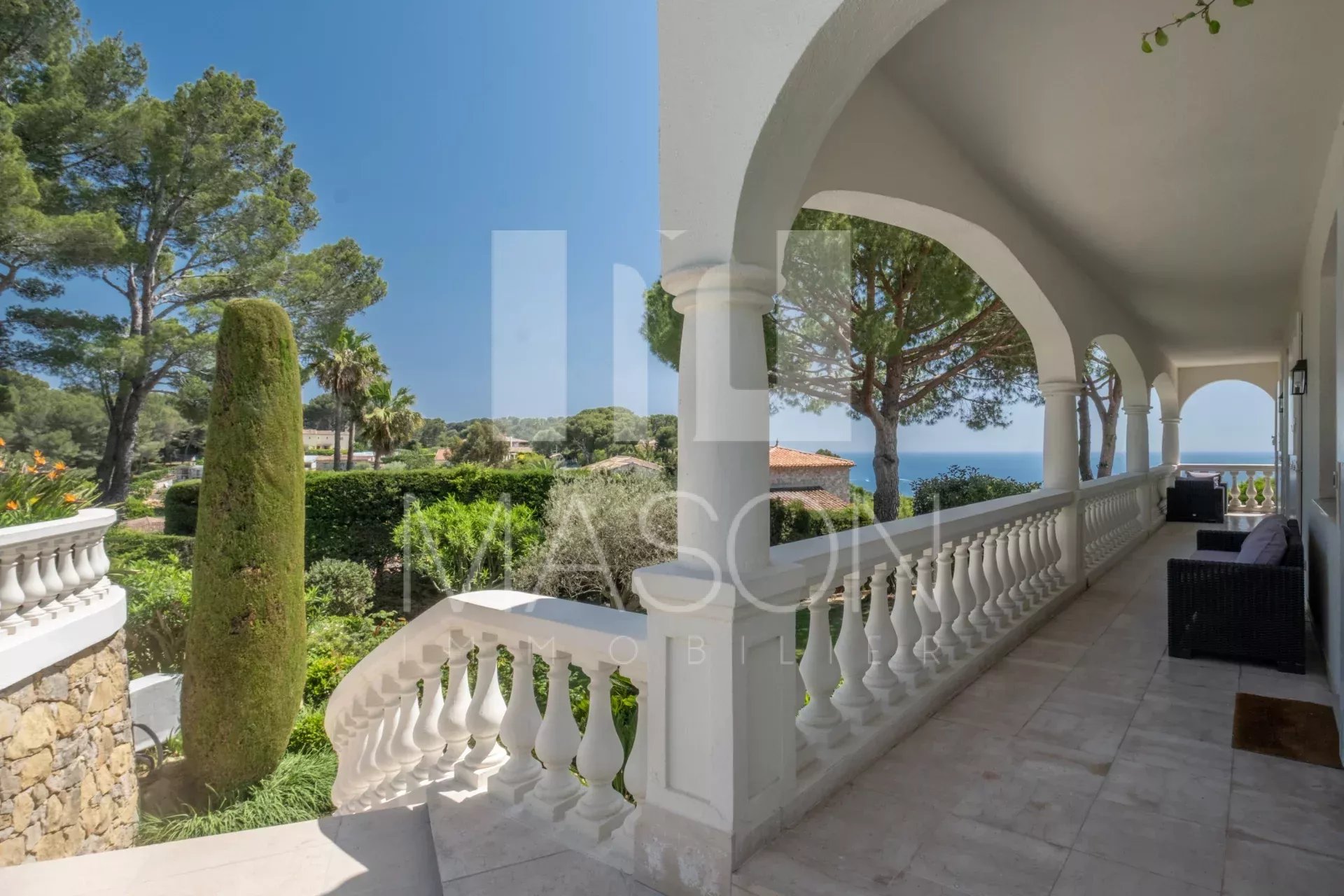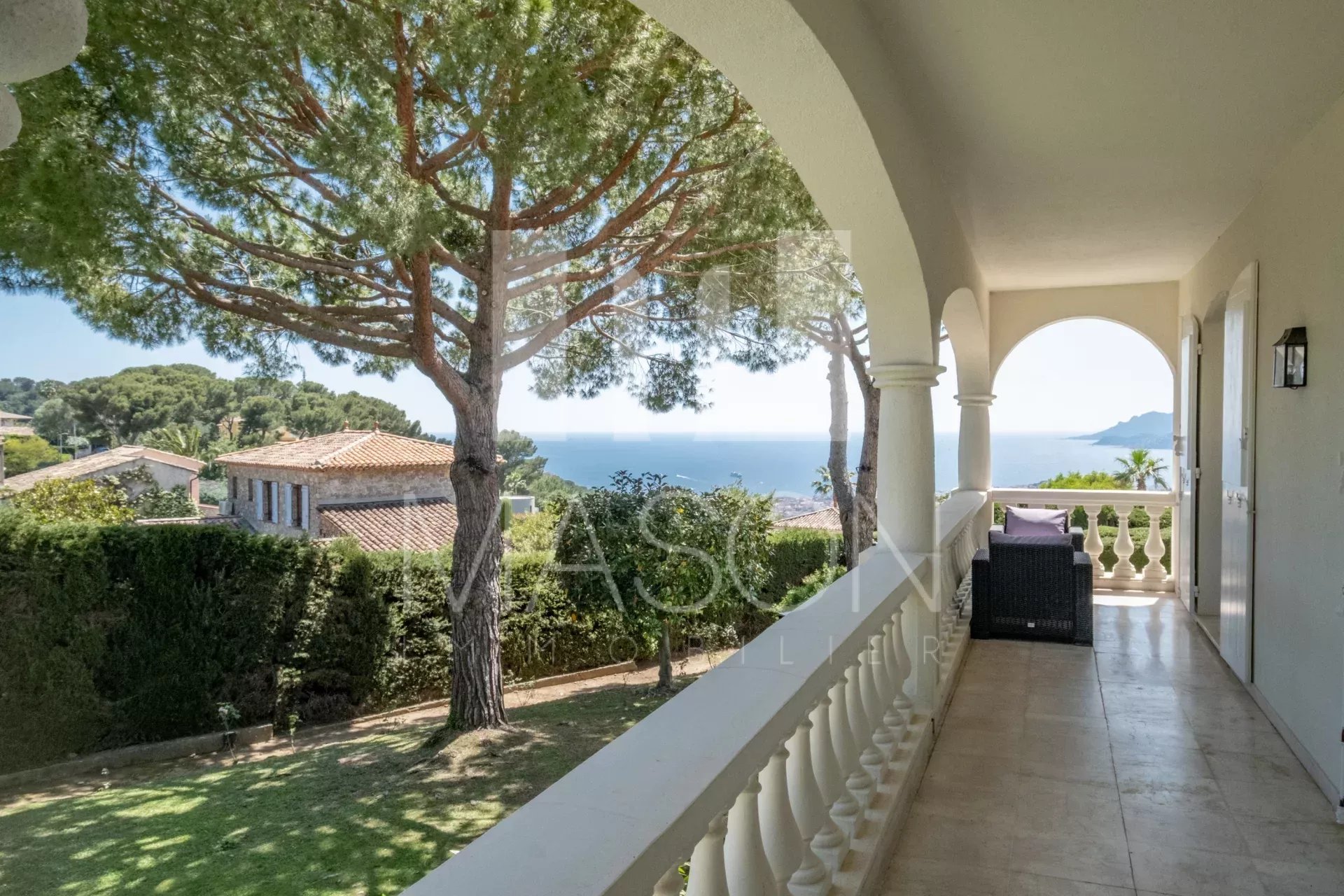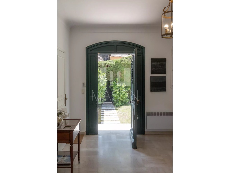 Villa avec vue panoramique sur baie de Cannes , sur 2 niveaux composèe au rdc d'une hall d'entrée avec placards et toilette invité, grand salon très confortable avec cheminée et salle à manger donnant sur balcons et loggia, cuisine équipée de tout,1 chambre avec sa salle de bains, en rez de jardin 3 grandes chambres avec placards et toutes donnant sur jardin, 3 salles de bain plus une pièce aveugle pouvant servir de 5ème chambre avec un lit de 140 , Coffre fort. Entierement climatisée. Terrasse equipée pour vos repas en pleine air,salon d'été,BBQ et plancha. Piscine chauffée 11X5m. 2000m2 de Jardin clôturé et arboré, portail automatisé, alarme reliée à société de surveillance 6 caméras vidéo avec écran LCD barrières de sécurité infra rouge, garage fermé parking 6 voitures internet WIFI TV HIFI, éclairage jardin, table de tennis.