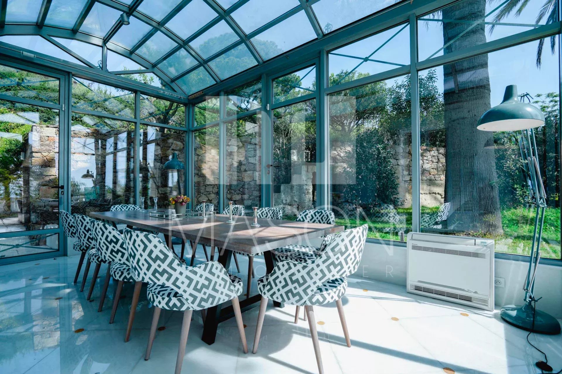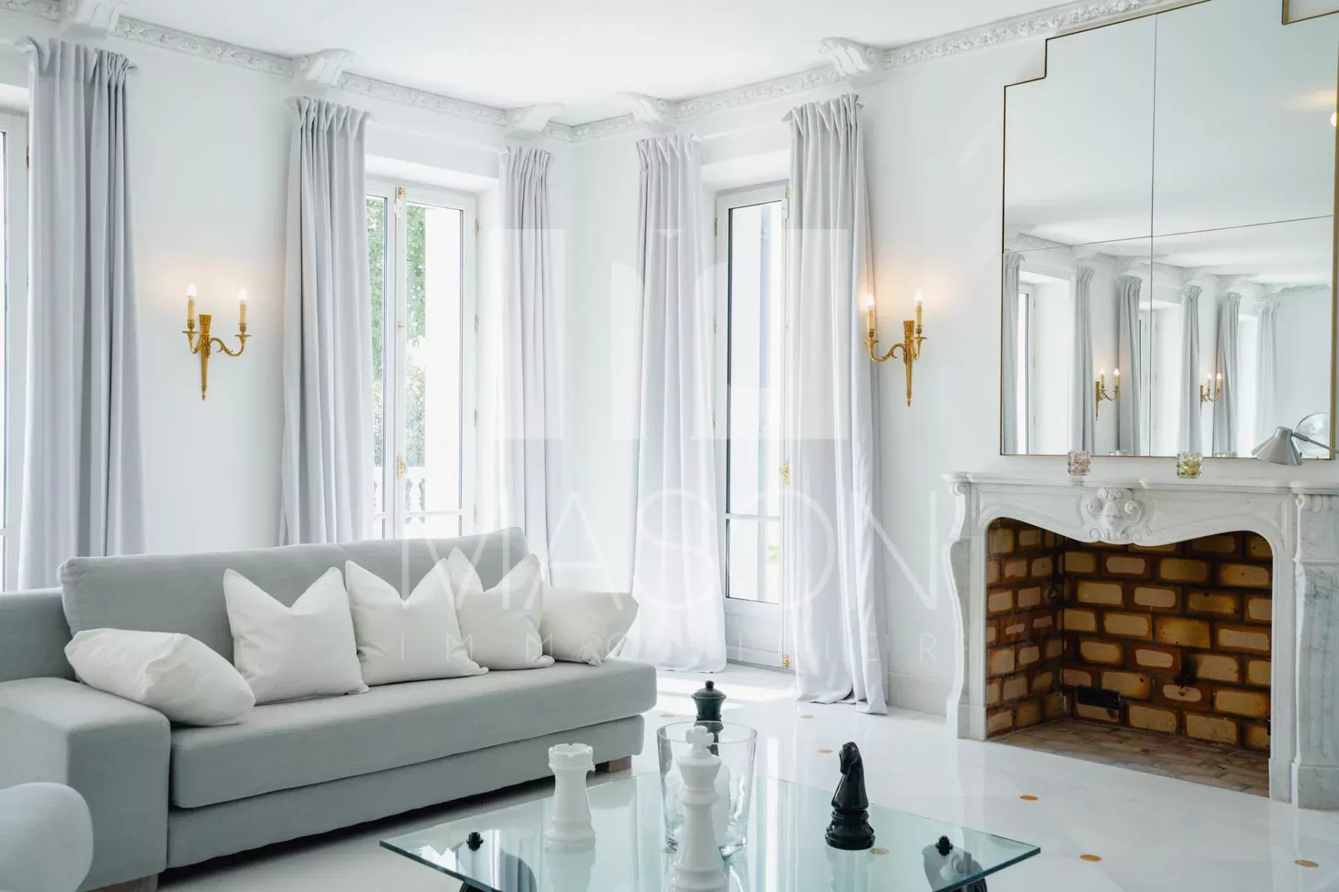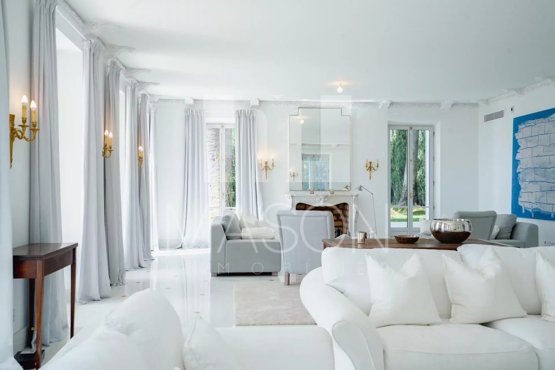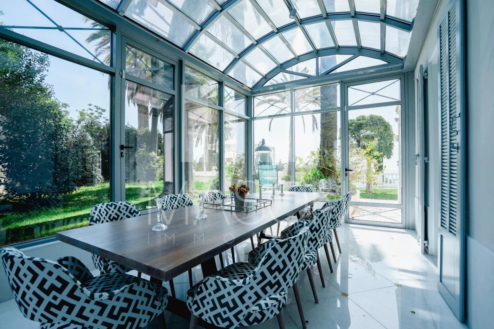 Exceptionnelle Villa Belle Epoque, tout juste rénovée avec des finitions du plus haut niveau. La Villa Reale est située à Golf Juan entre Cannes et le Cap d'Antibes. Depuis ses 7 suites vous pourrez profiter d'une magnifique vue sur la mer grâce à son exposition plein sud. La maison principale de 4 étages avec ascenseur offre un grand séjour ouvrant sur la terrasse panoramique extérieure et une cuisine moderne ainsi qu'une salle à manger dans la belle véranda. Aux deux premiers étages se trouvent 4 chambres avec leur propre salle de bain et au troisième étage une grande chambre avec deux lits doubles et une salle de bain. A l'extérieur, un jardin en restanques avec une grande piscine chauffée et un parking intérieur pour au moins 6 voitures.