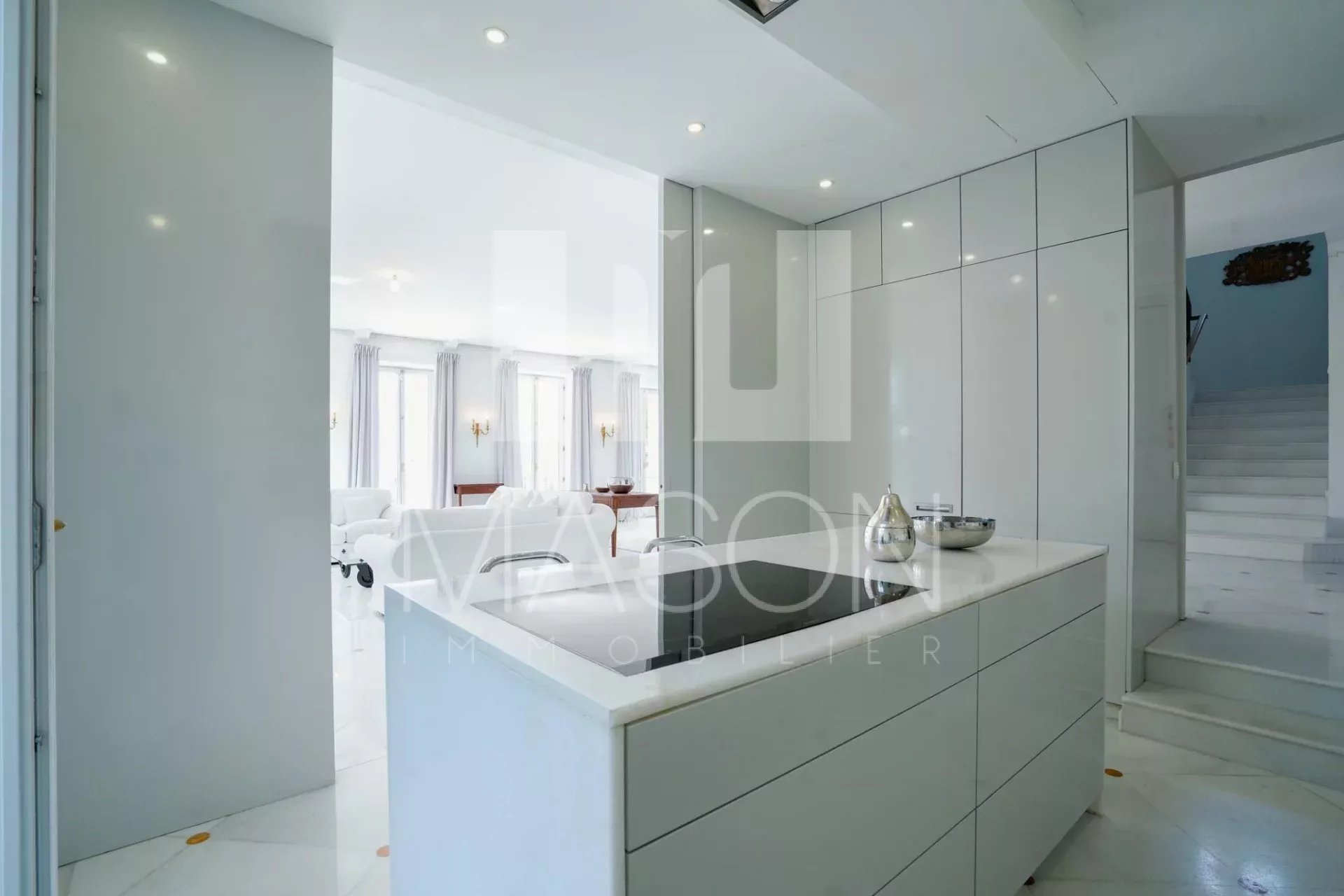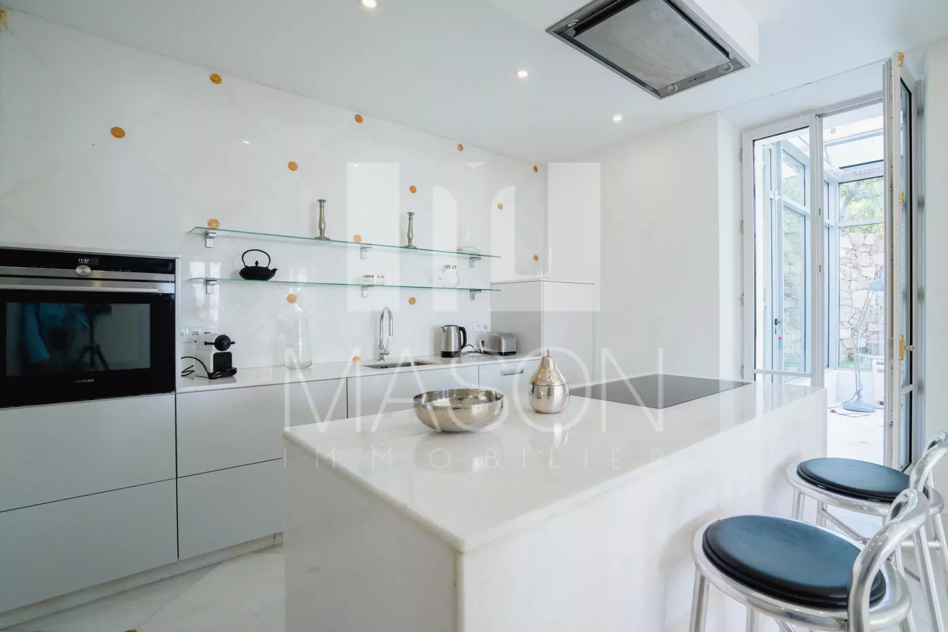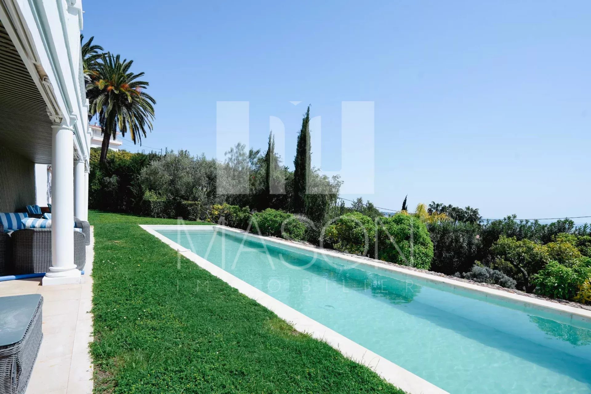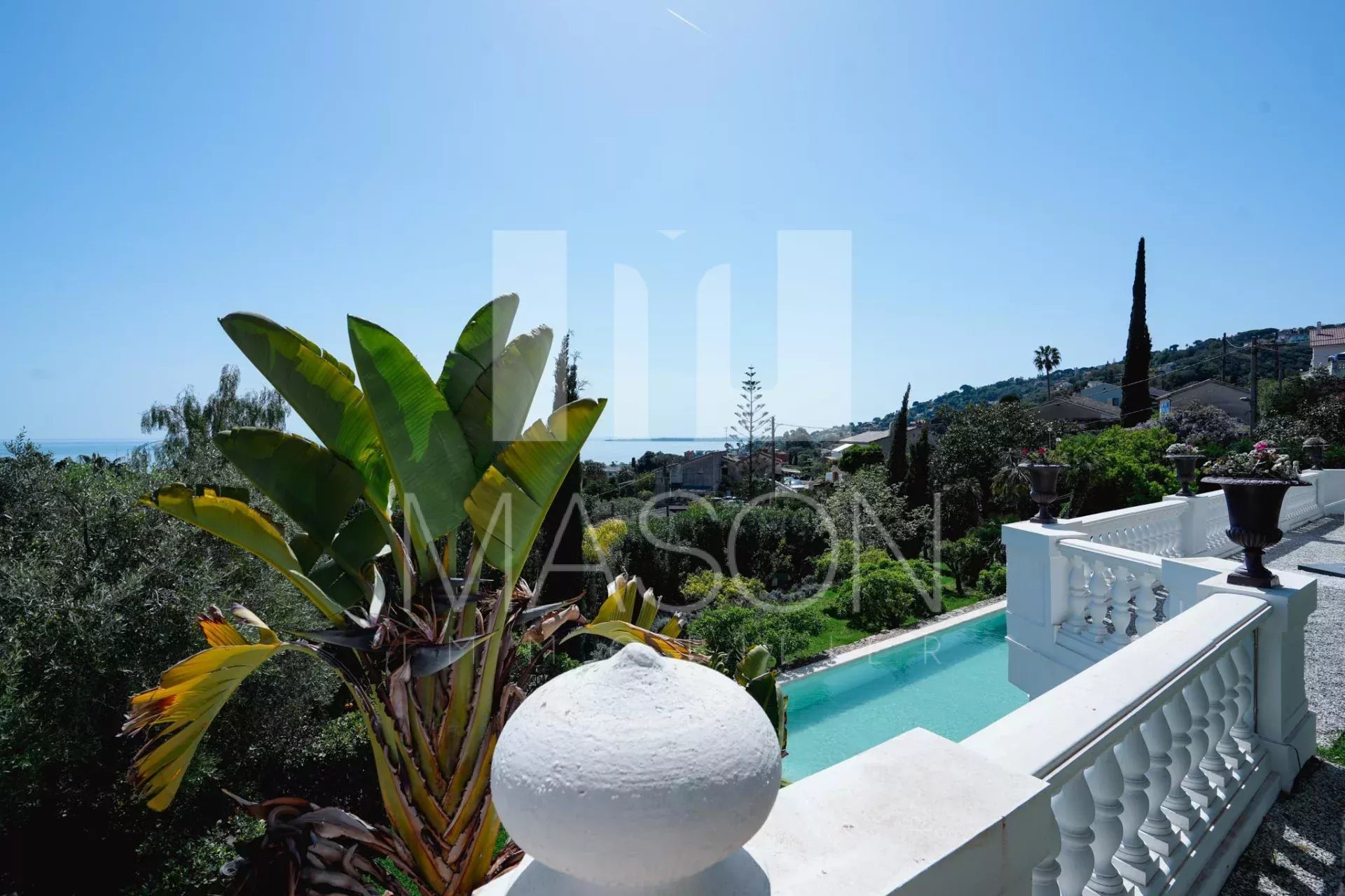 Villa avec vue panoramique sur baie de Cannes , sur 2 niveaux composèe au rdc d'une hall d'entrée avec placards et toilette invité, grand salon très confortable avec cheminée et salle à manger donnant sur balcons et loggia, cuisine équipée de tout,1...
