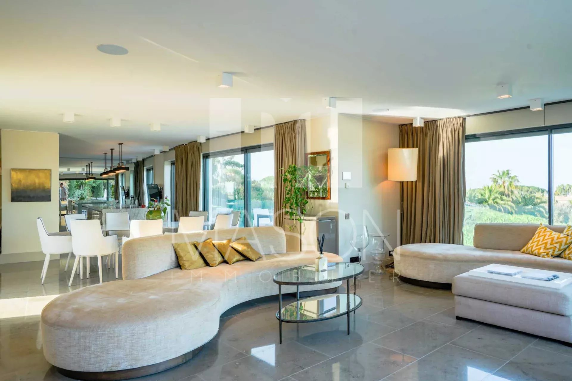 Living avec salon, salle à manger et cuisine américaine qui s'ouvre complètement sur la terrasse extérieure. 6 chambres avec leurs salle de bains.